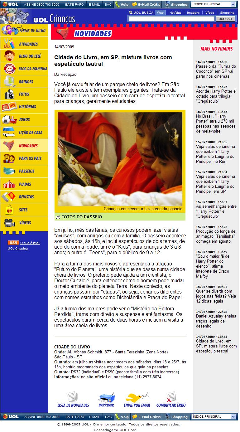 Portal UOL (Crianças) - Cidade do Livro mistura leitura com espetáculo