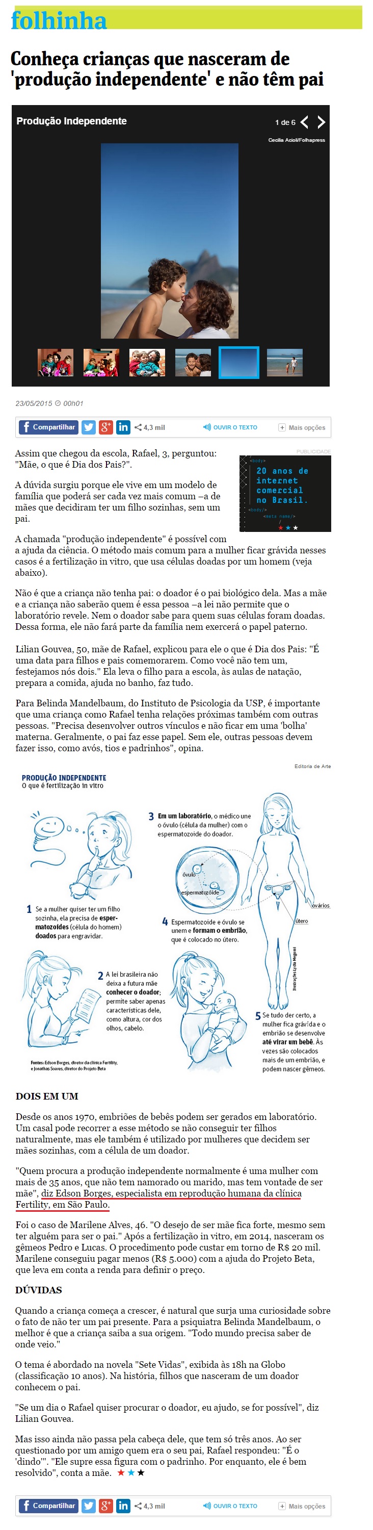 Clipping JORNAL FOLHINHA (ONLINE) - Conheça crianças que nasceram de 'produção independente' e não tem pai 08/09/2015