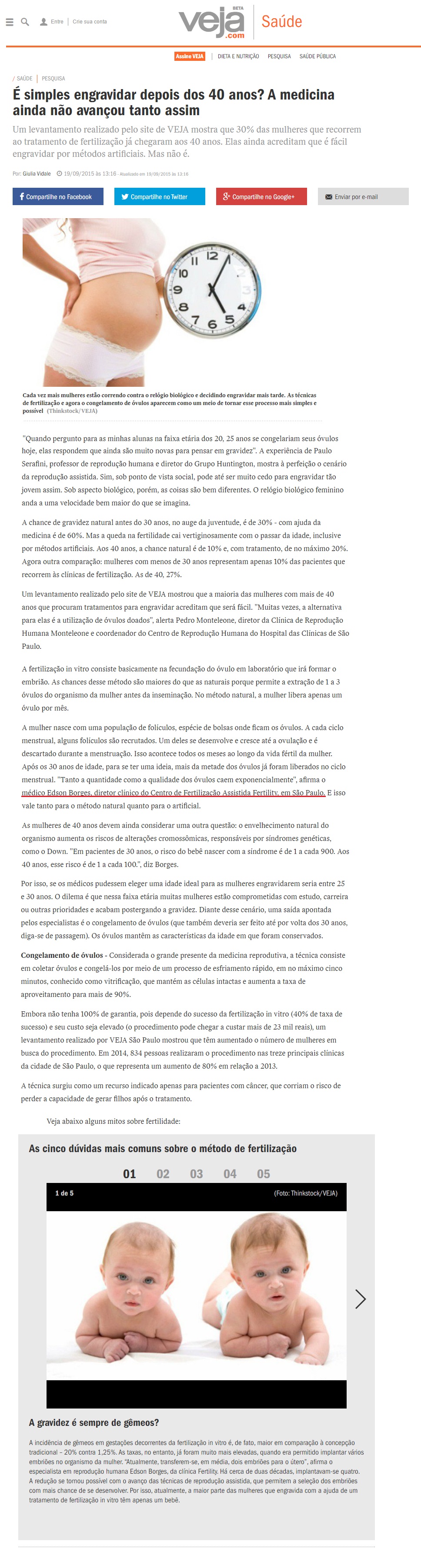 Clipping REVISTA VEJA (ONLINE) - É simples engravidar depois dos 40 anos? A medicina ainda não avançou tanto assim 22/09/2015