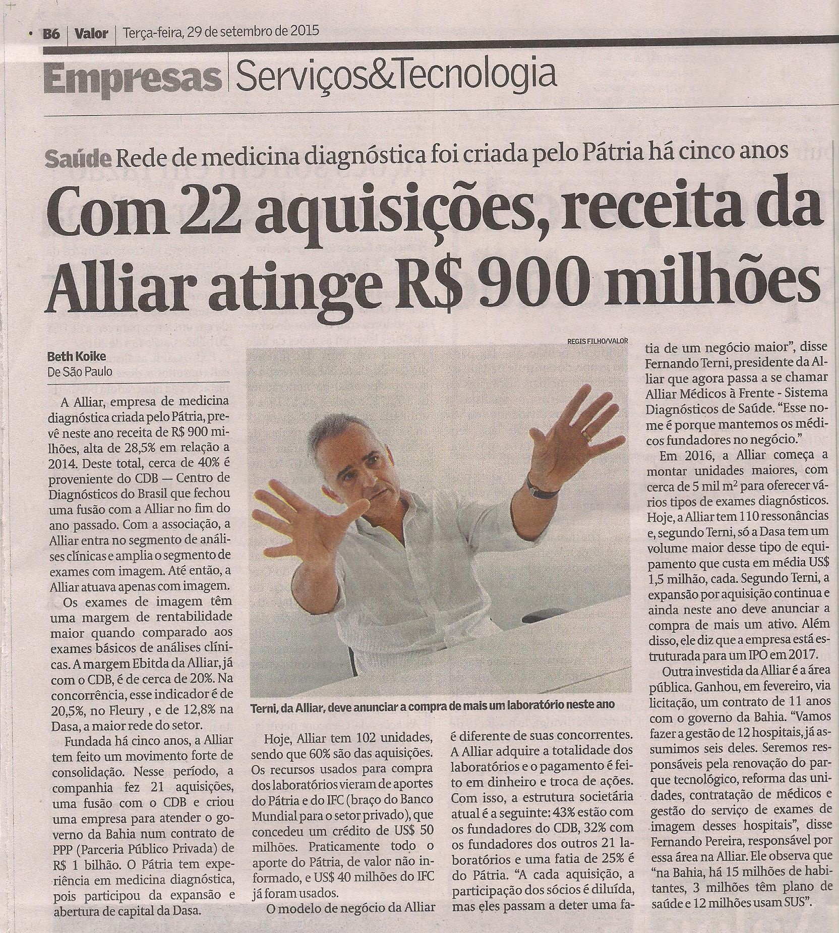 JORNAL VALOR ECONÔMICO (IMPRESSO) - Receita da Alliar atinge R$900 milhões