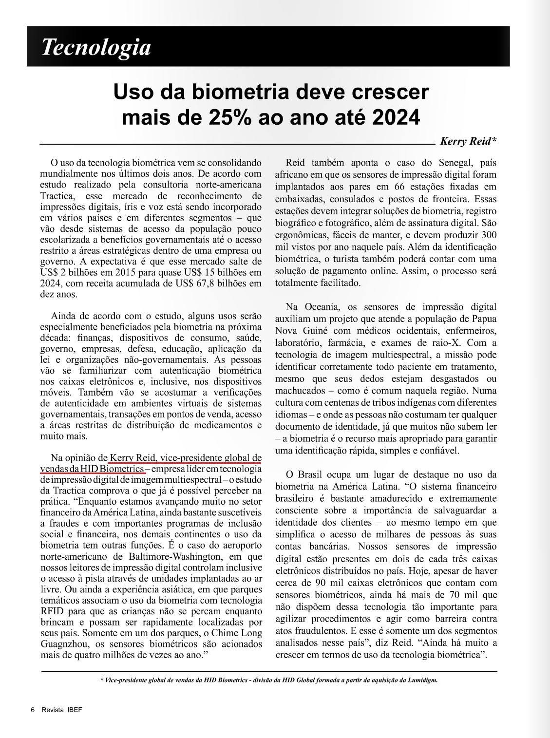 Clipping REVISTA IBEF (INSTITUTO BRASILEIRO DE EXECUTIVOS DE FINANÇAS) (IMPRESSO) - Uso da biometria deve crescer mais de 25% ao ano até 2024 14/10/2015