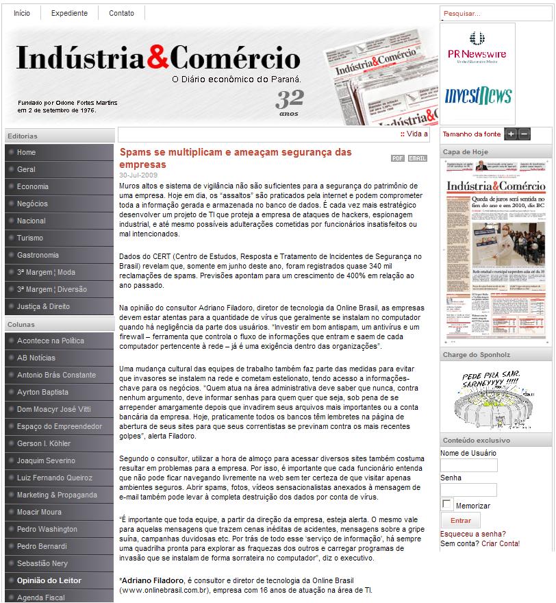 Clipping Jornal Indústria & Comércio (30 Jul) - Spams se multiplicam e ameaçam segurança das empresas 03/08/2009
