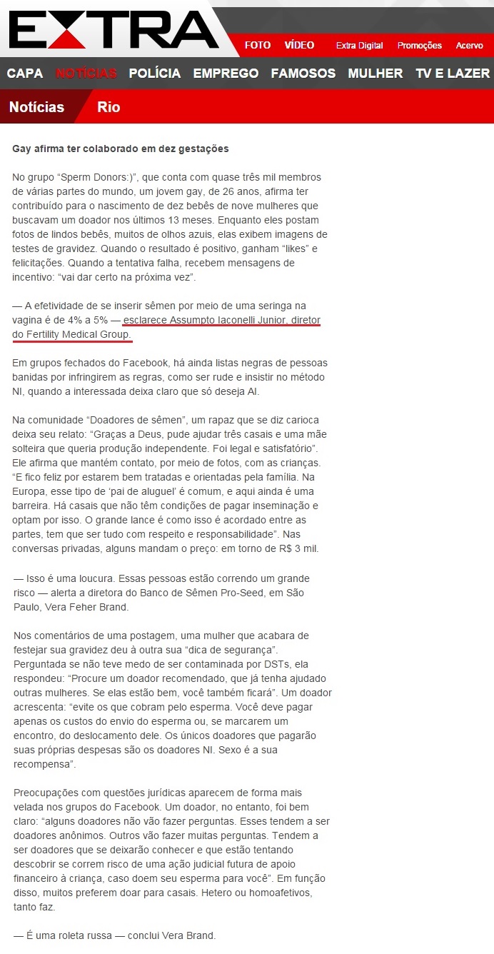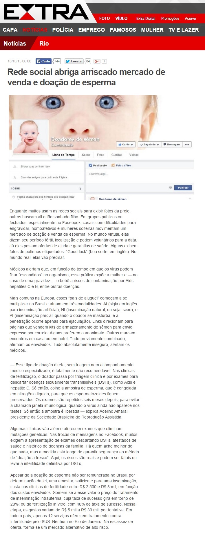 Clipping JORNAL EXTRA (GLOBO) (ONLINE) - Rede social abriga arriscado mercado de venda e doação de esperma 19/10/2015