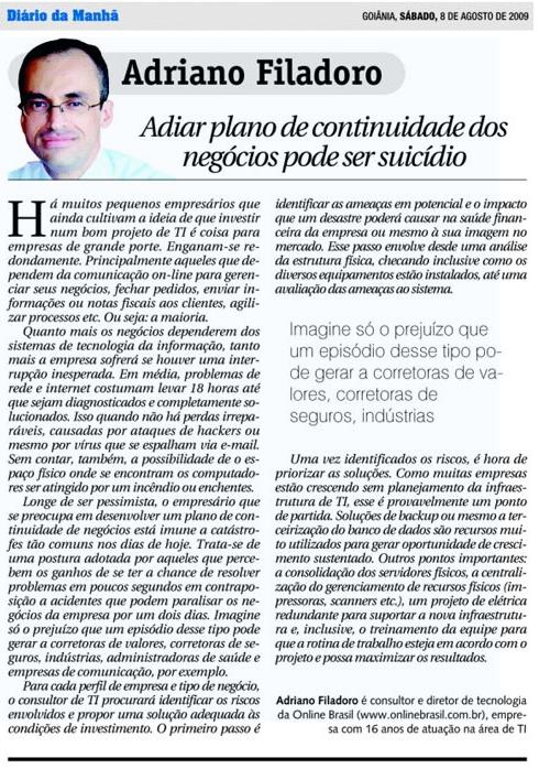 Clipping Diário da Manhã - Goiânia/GO (8 Ago) - Adiar plano de continuidade dos negócios pode ser suicídio 10/08/2009