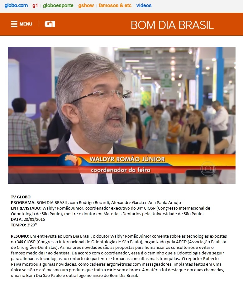 Clipping BOM DIA BRASIL (TV GLOBO) - Feira de Odontologia mostra novidades para quem tem medo de dentista 28/01/2016