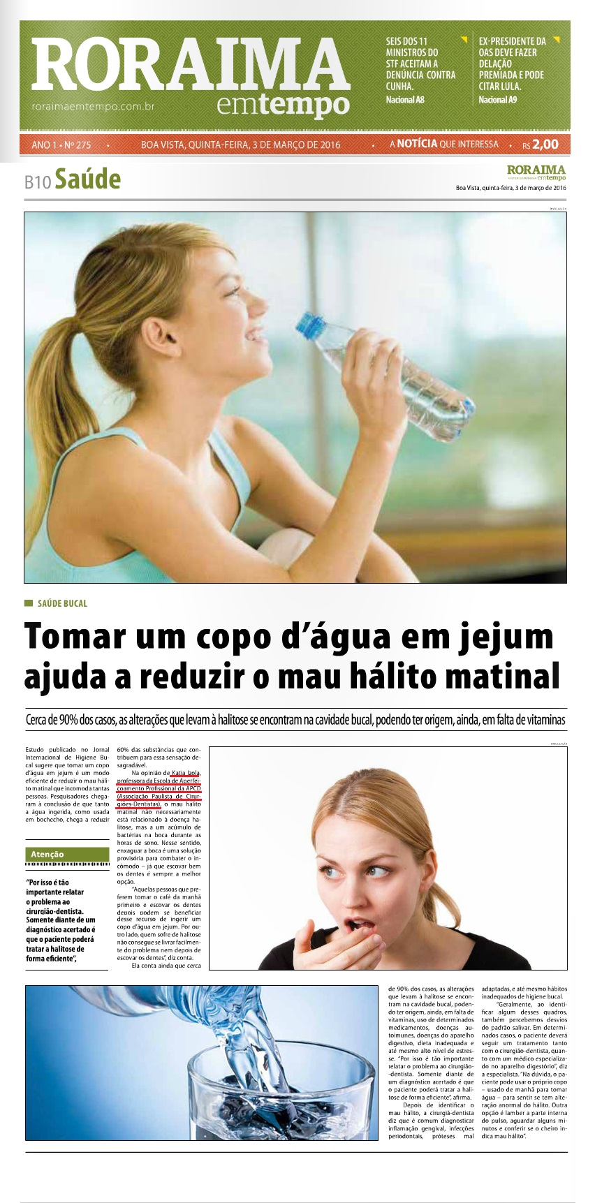 Clipping JORNAL RORAIMA EM TEMPO (IMPRESSO) - Tomar um copo d’água em jejum contribui para reduzir o mau hálito matinal 08/03/2016