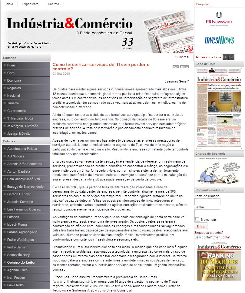 Clipping Jornal Indústria & Comércio (8 Set) - Como terceirizar serviços de TI sem perder o controle? 14/09/2009