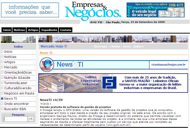 Clipping Jornal Empresas & Negócios (14 Set) - Versão gratuita de software de gestão de projetos 15/09/2009