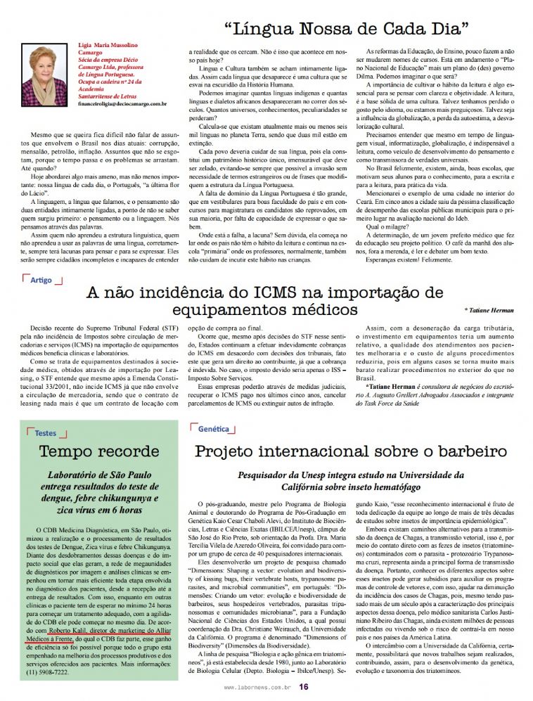Clipping REVISTA LABOR NEWS (IMPRESSO) - Laboratório de São Paulo entrega resultados do teste de dengue, febre chikungunya e zica vírus em 6 horas 11/04/2016
