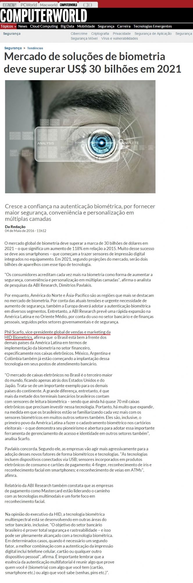 Clipping COMPUTER WORLD (SITE) - Mercado de soluções de biometria deve superar US$ 30 bilhões em 2021 05/05/2016