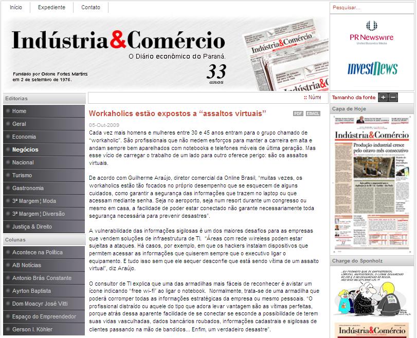 Clipping Jornal Indústria & Comércio (5 Set) - Workaholics estão expostos a 'assaltos virtuais' 06/10/2009