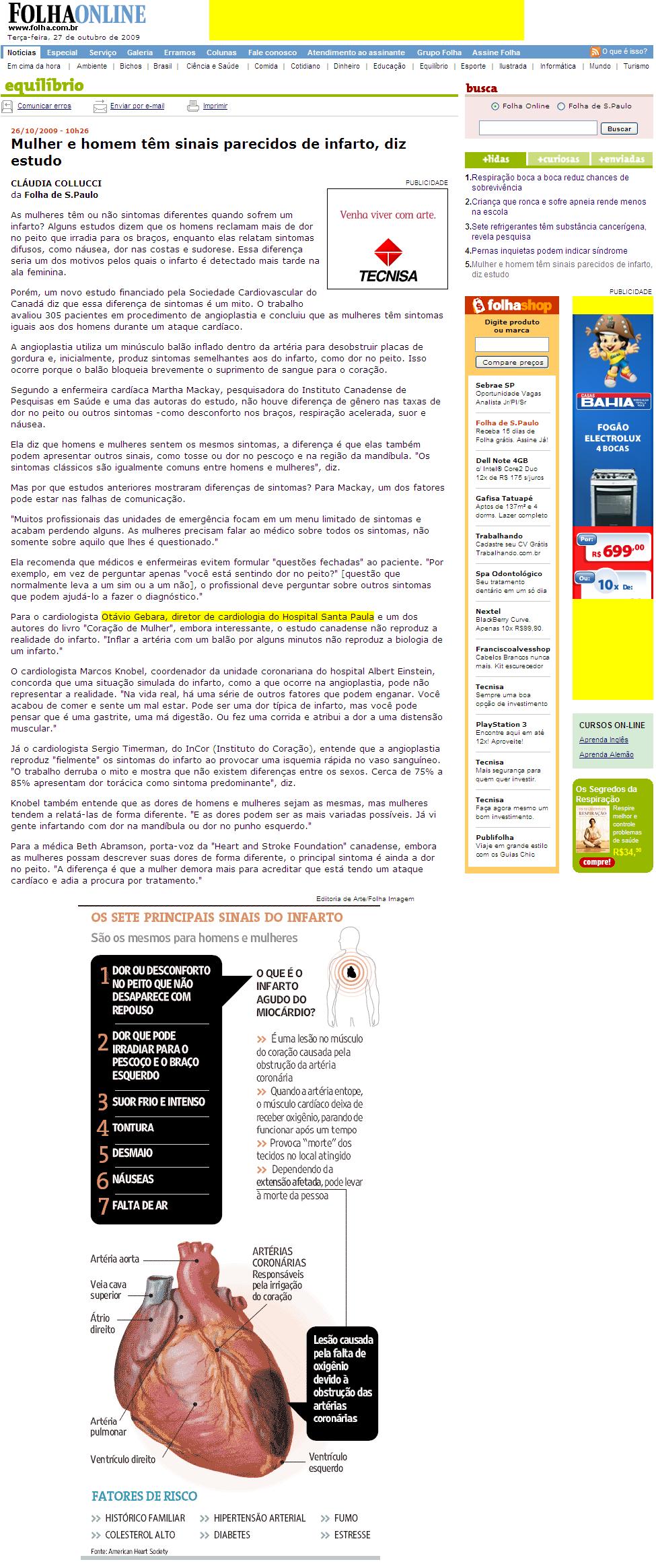 Folha Online - Mulher e homem têm sinais parecidos de infarto, diz estudo