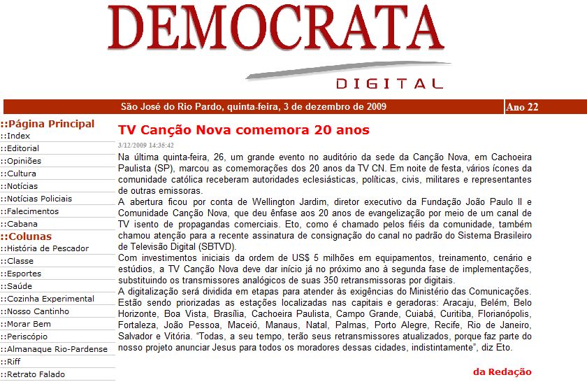 DEMOCRATA (S.José do Rio Pardo/SP) - TV Canção Nova comemora 20 anos