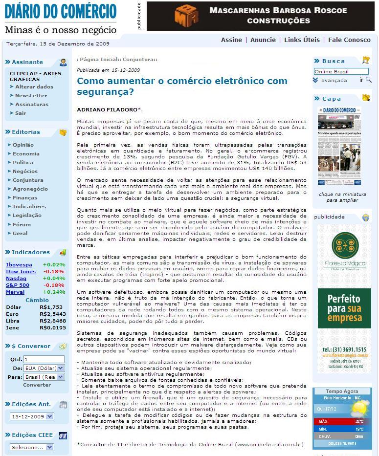 Clipping DIÁRIO DO COMÉRCIO/MG (15 Dez) - Como aumentar o comércio eletrônico com segurança? 15/12/2009