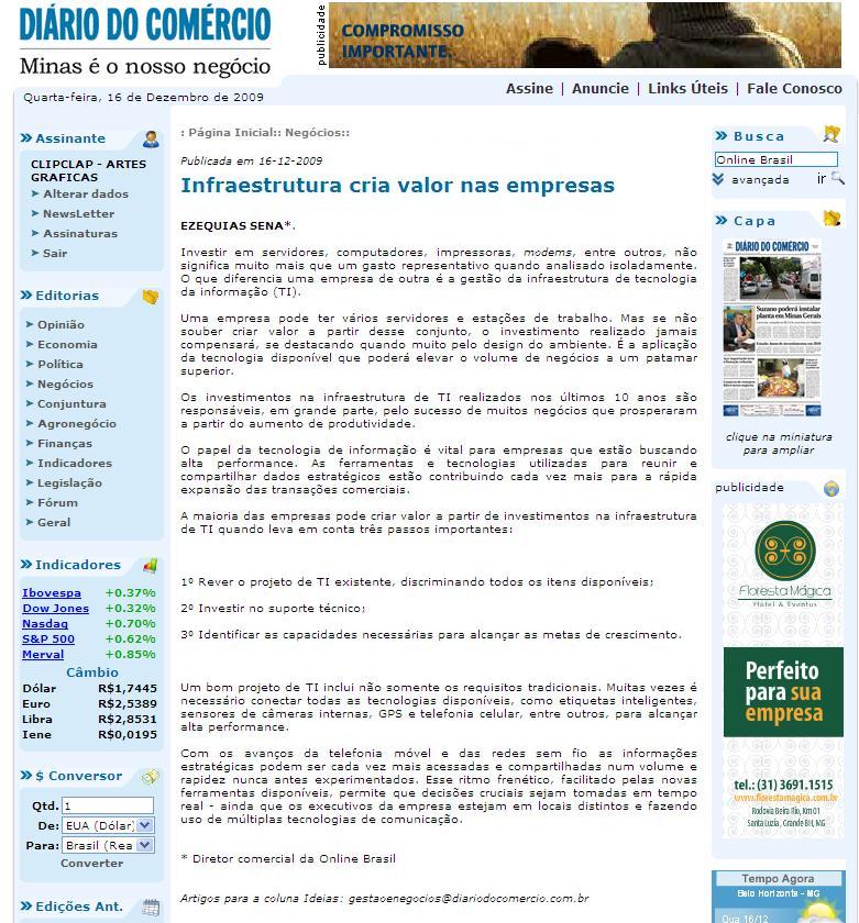 DIÁRIO DO COMÉRCIO/MG (16 Dez) - Infraestrutura cria valor nas empresas