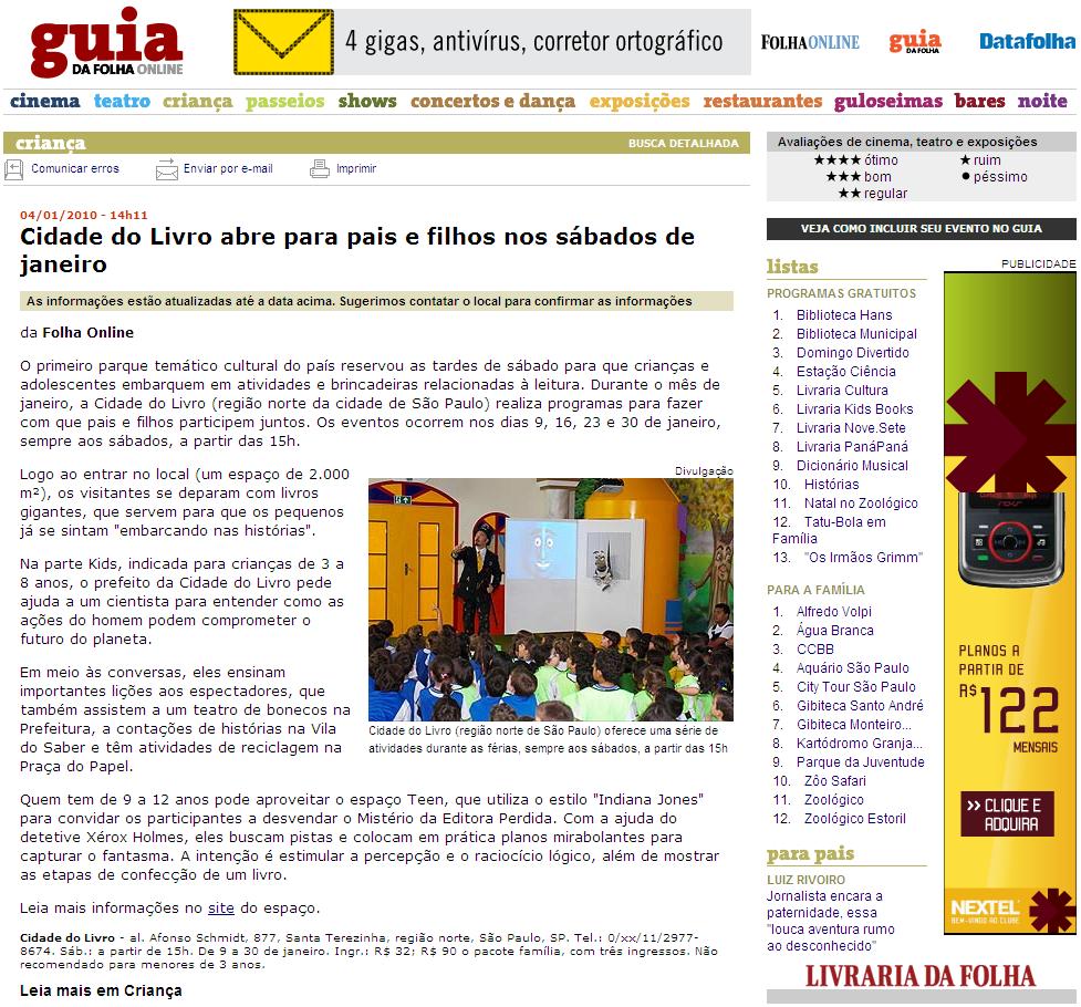 Clipping FOLHA ONLINE (CHAMADA DE CAPA + MATÉRIA) - Cidade do Livro abre para pais e filhos nos sábados de janeiro 05/01/2010