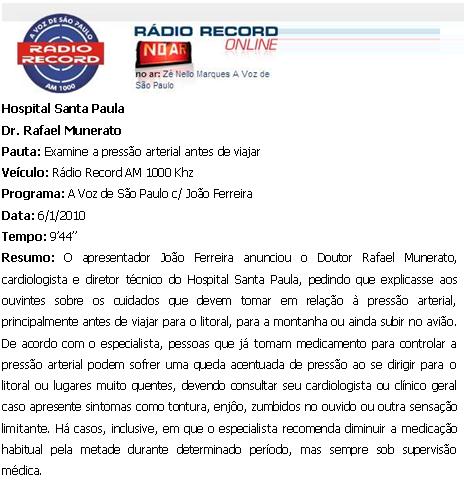 RÁDIO RECORD AM 1000 KHz - Hospital Santa Paula / Dr. Rafael Munerato