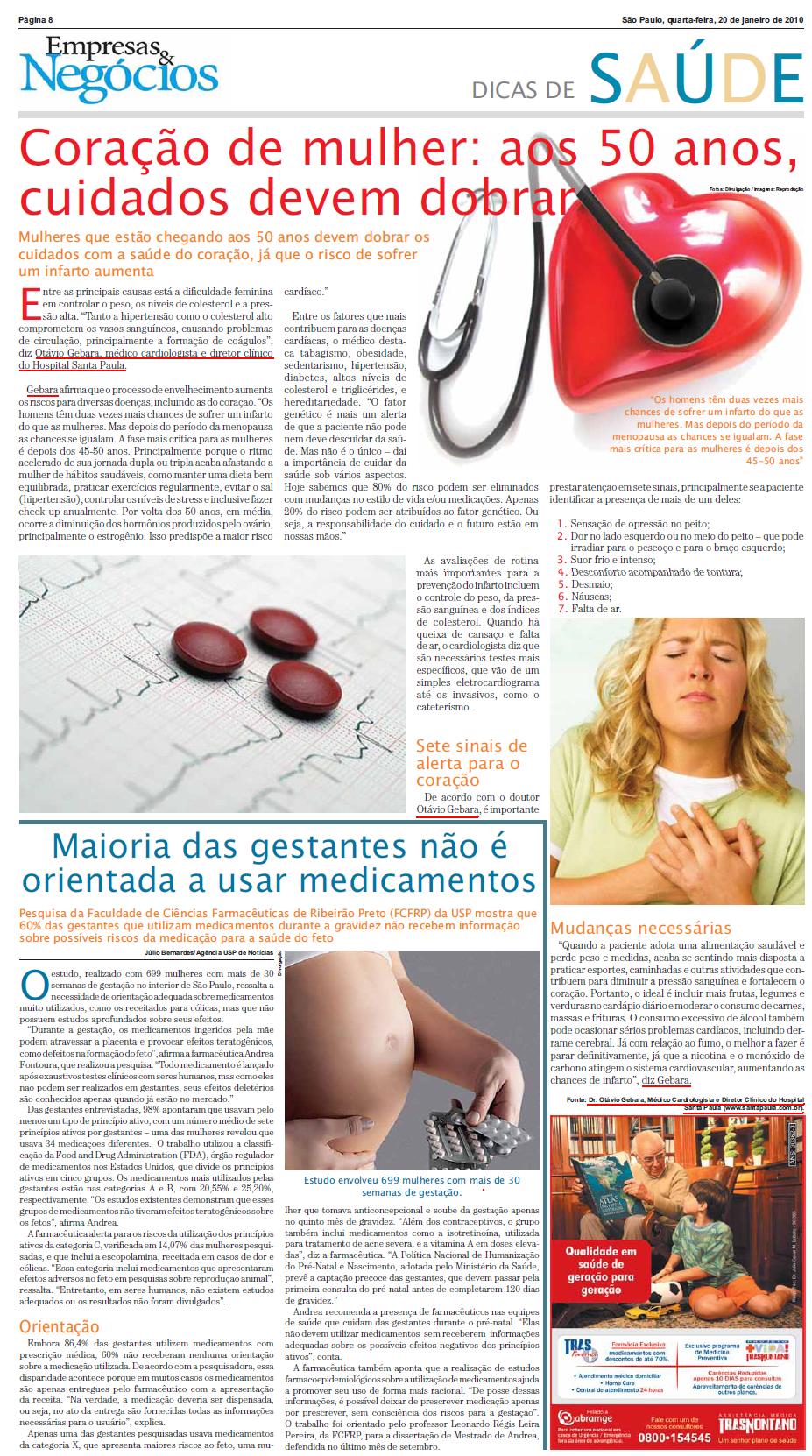 Clipping JORNAL EMPRESAS & NEGÓCIOS (20 Jan) - Coração de mulher: aos 50 anos, cuidados devem dobrar 20/01/2010