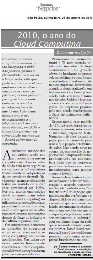 JORNAL EMPRESAS & NEGÓCIOS (28 Jan) - 2010, o ano do cloud computing