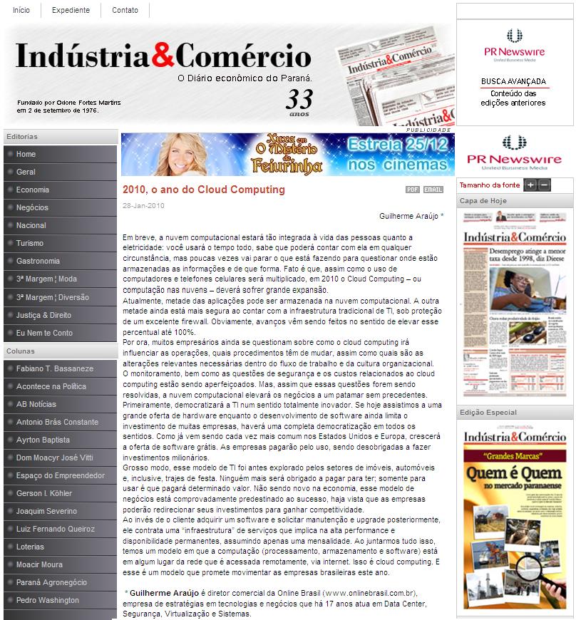 JORNAL INDÚSTRIA & COMÉRCIO (28 Jan) - 2010, o ano do cloud computing