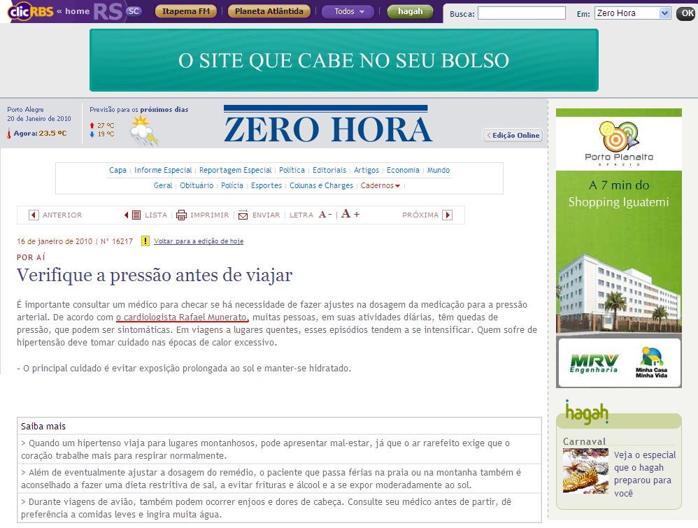 Clipping ZERO HORA (PORTO ALEGRE/RS) (16 Jan) - Verifique a pressão arterial antes de viajar 05/02/2010