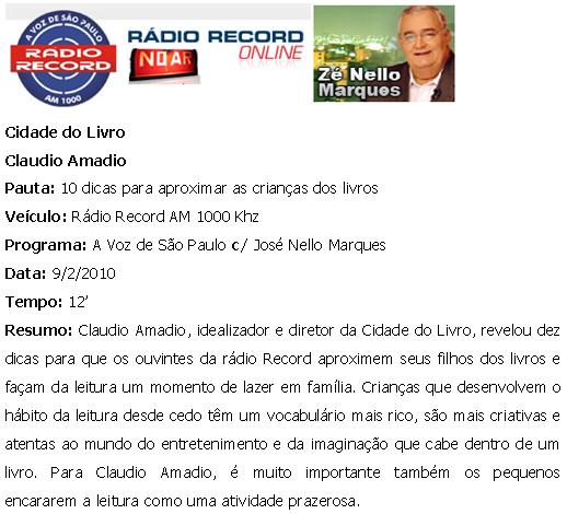 RÁDIO RECORD AM 1000 KHz - Cidade do Livro / Claudio Amadio