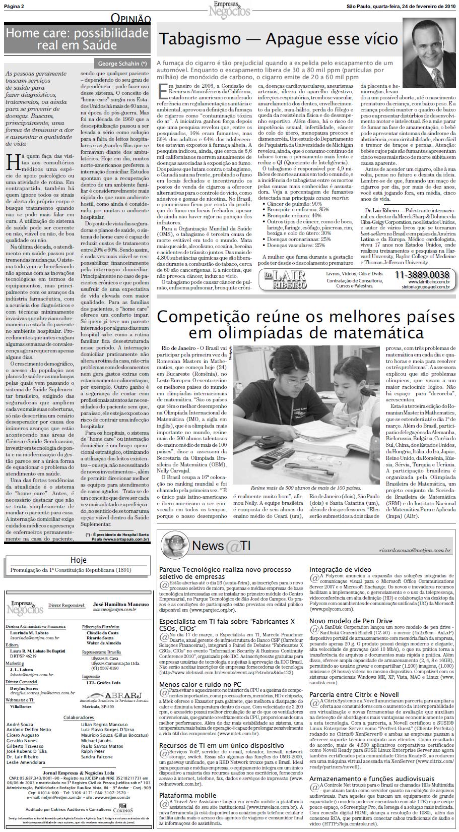 JORNAL EMPRESAS & NEGÓCIOS (24 Fev) - Home care: possibilidade real em saúde