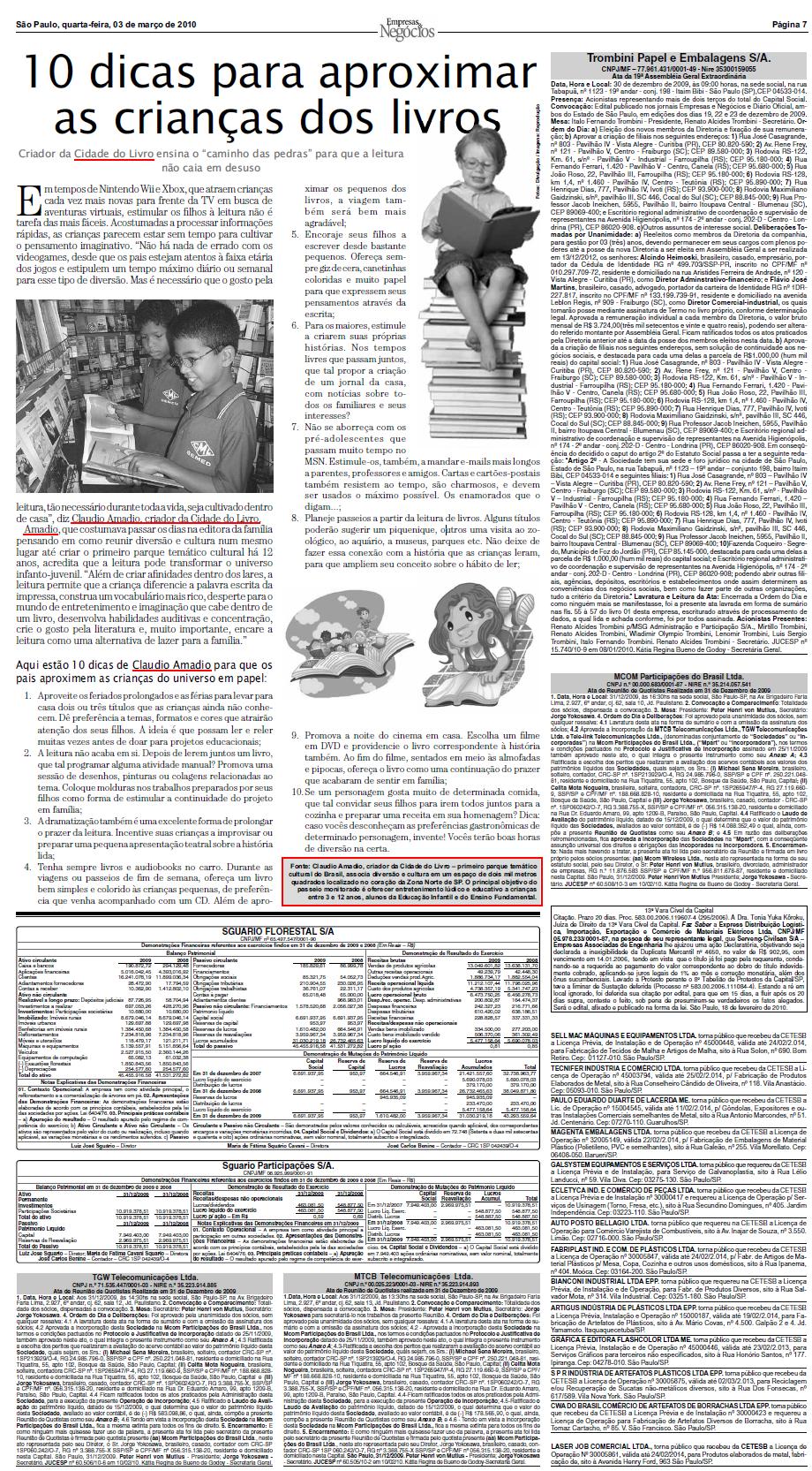 Clipping JORNAL EMPRESAS & NEGÓCIOS (3 Mar) - 10 dicas para aproximar as crianças dos livros 03/03/2010