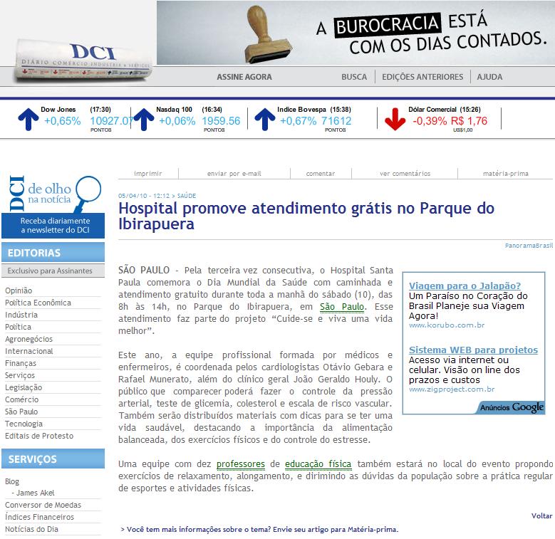 Clipping JORNAL DCI (DIGITAL) - Hospital promove atendimento grátis no Parque do Ibirapuera 05/04/2010