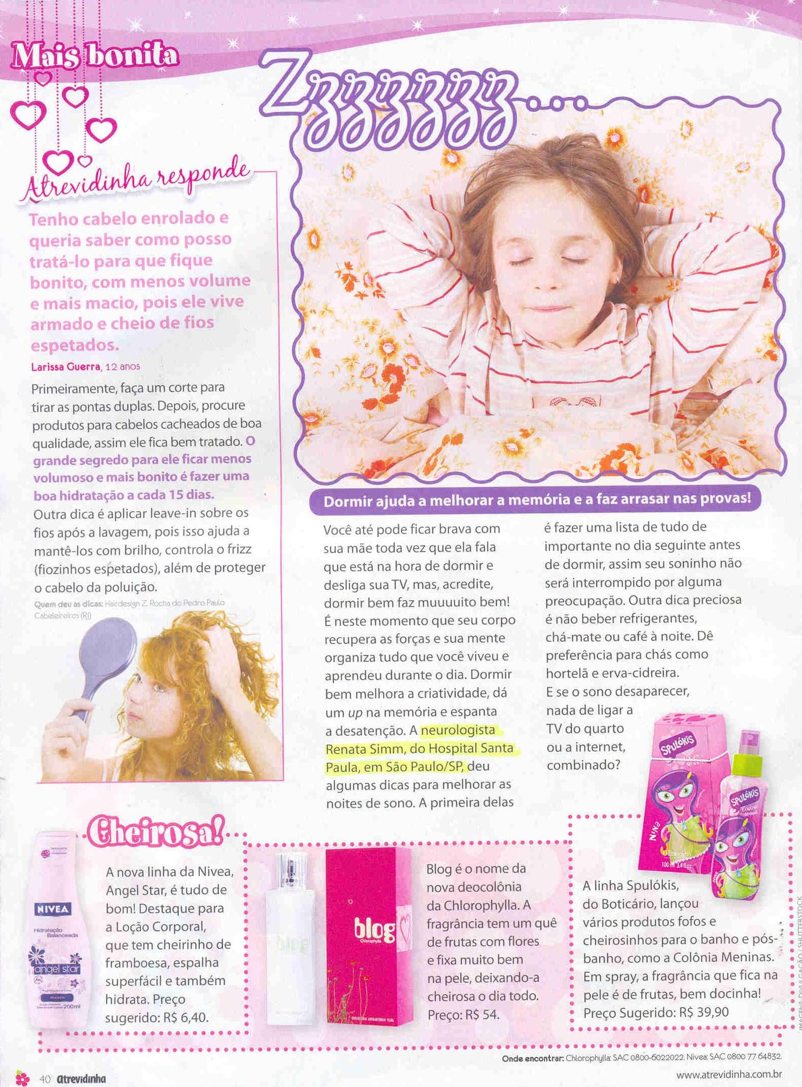Clipping REVISTA ATREVIDINHA (ABR) - Dormir ajuda a melhorar a memória e a faz arrasar nas provas! 07/04/2010