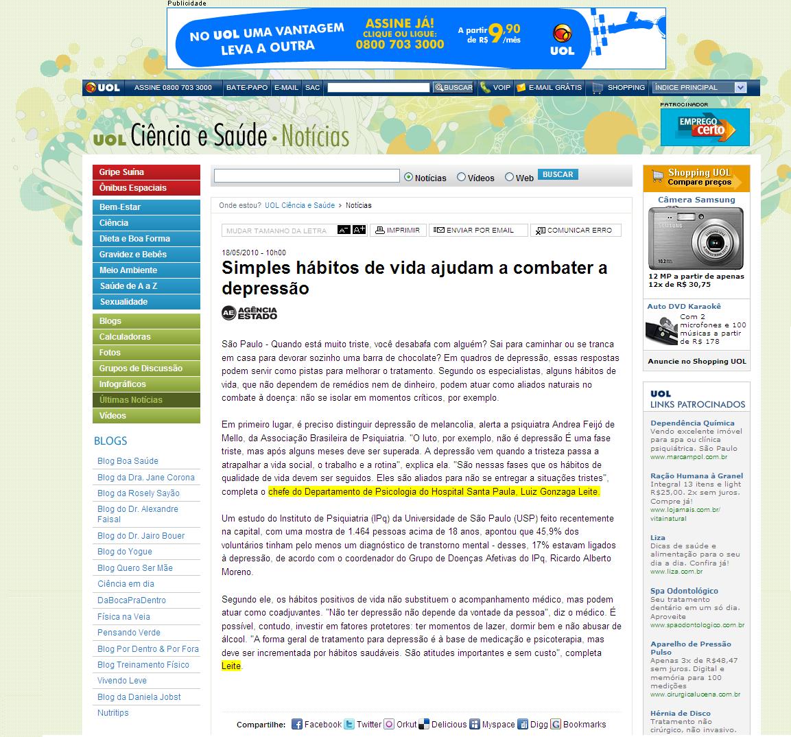 Clipping PORTAL UOL (CIÊNCIA E SAÚDE) - Simples hábitos de vida ajudam a combater a depressão 19/05/2010