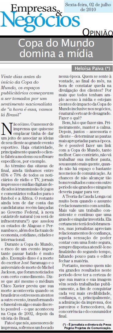 JORNAL EMPRESAS & NEGÓCIOS (IMPRESSO) - Copa do Mundo domina a mídia