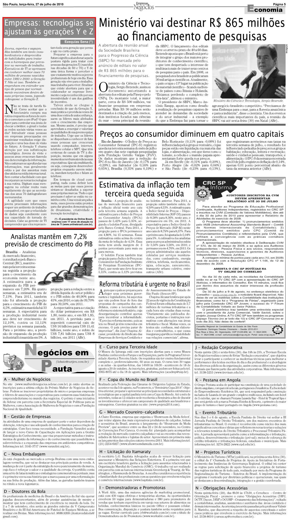 Clipping JORNAL EMPRESAS & NEGÓCIOS (IMPRESSO) - Empresas: tecnologias se ajustam às gerações Y e Z 28/07/2010