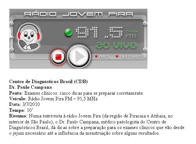 Clipping RÁDIO JOVEM PIRA (SP) - Exames clínicos: cinco dicas para se preparar corretamente 28/07/2010