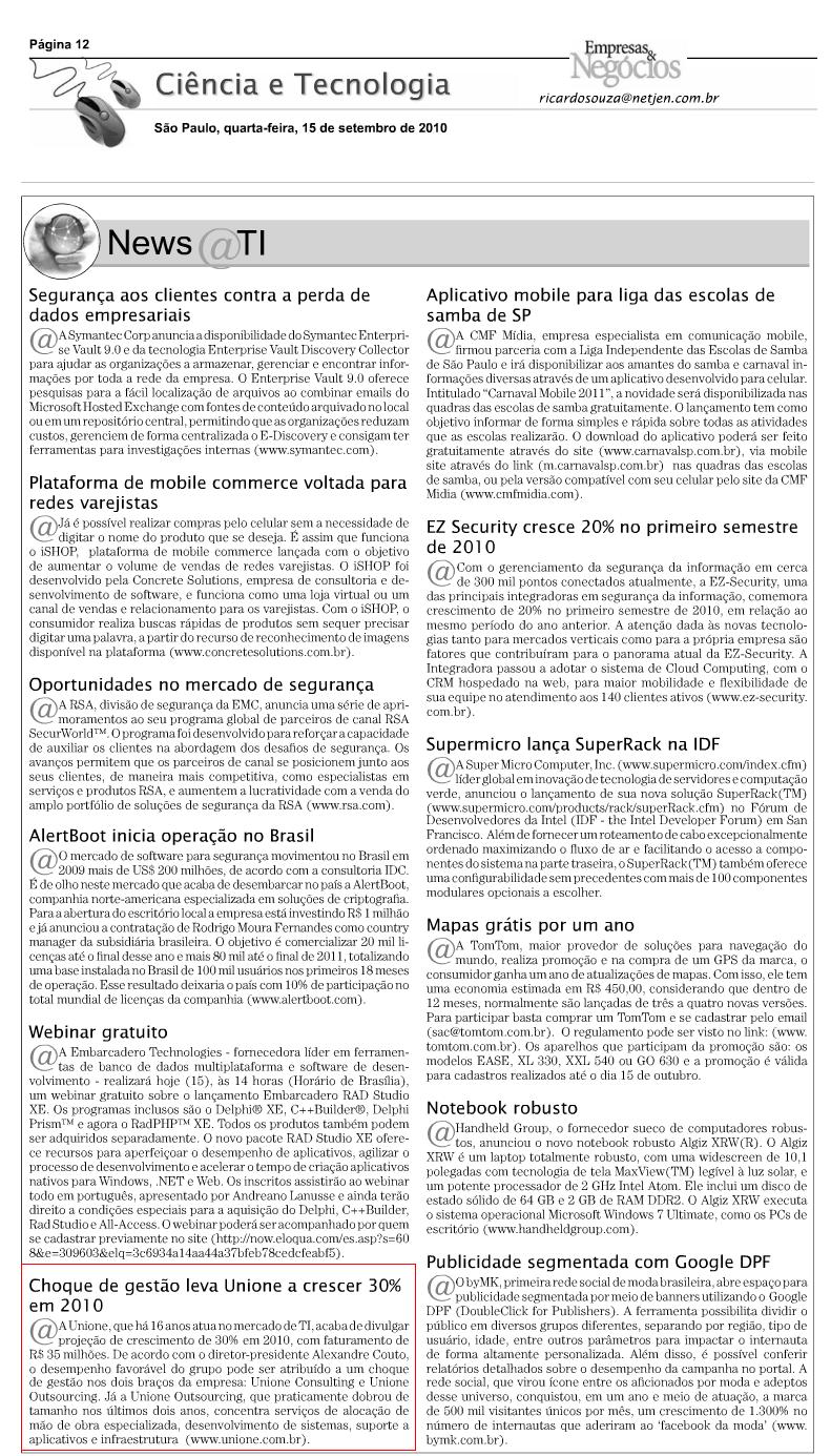 Clipping JORNAL EMPRESAS & NEGÓCIOS (IMPRESSO E DIGITAL) - Choque de gestão faz Unione crescer 30% em 2010 15/09/2010