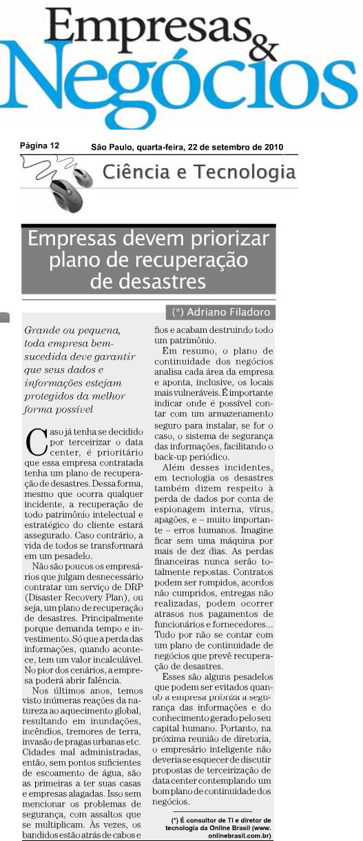 Clipping JORNAL EMPRESAS & NEGÓCIOS - Empresas devem priorizar plano de recuperação de desastres 22/09/2010
