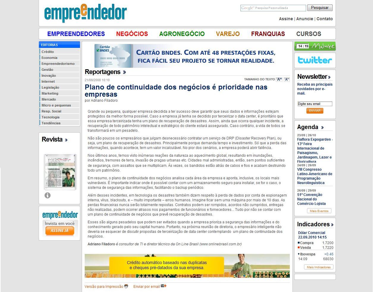 Clipping PORTAL DO EMPREENDEDOR - Plano de continuidade dos negócios é prioridade nas empresas 22/09/2010