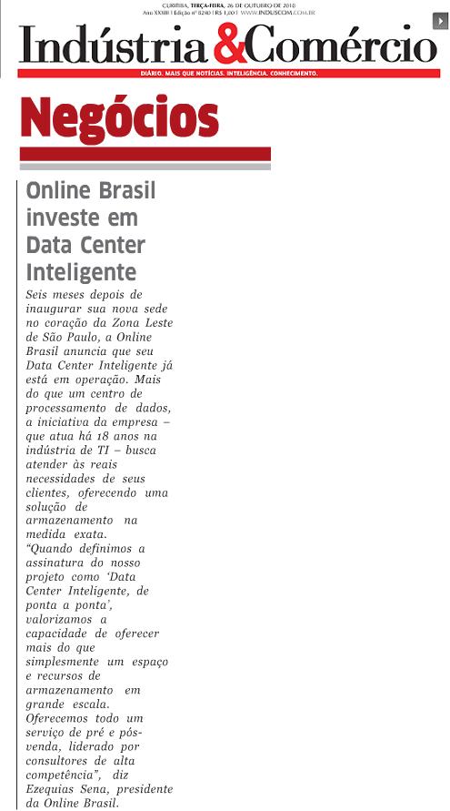 Clipping JORNAL INDÚSTRIA & COMÉRCIO (IMPRESSO/PR) - Online Brasil investe em Data Center Inteligente 03/11/2010