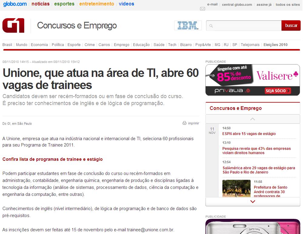 PORTAL G1 - Unione, que atua na área de TI, abre 60 vagas de Trainees