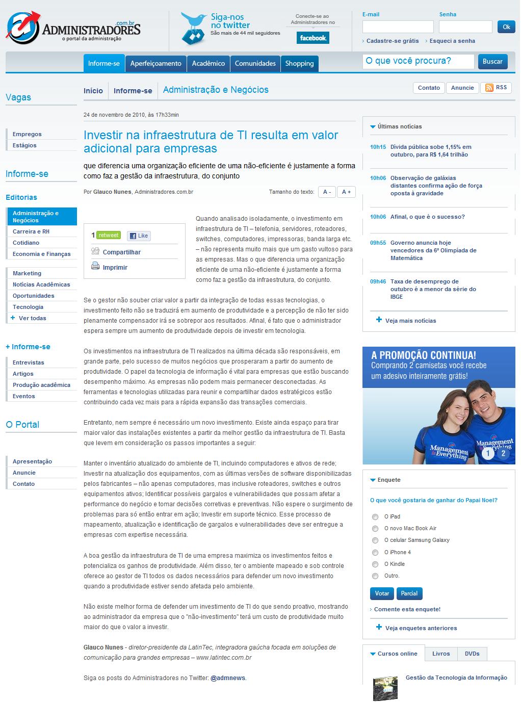 Clipping PORTAL ADMINISTRADORES - Investir na estrutura de TI resulta em valor adicional para empresas 25/11/2010