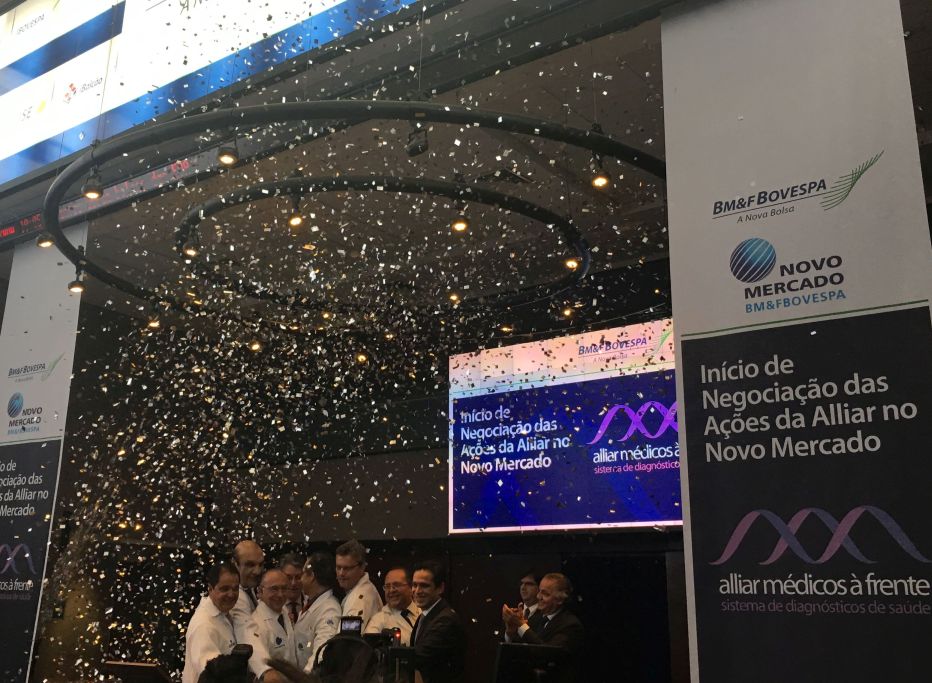 O grupo de medicina diagnóstica Alliar Médicos à Frente, que registrou crescimento de 15% ao ano entre 2009 e 2015, fez sua estreia na BM&F Bovespa na sexta-feira, dia 28, sob o ticker AALR3. Trata-se da primeira abertura de capital dos últimos 16 meses e os recursos obtidos com a oferta primária serão empregados na expansão do grupo – que reúne 23 marcas, está presente em dez estados, emprega cerca de 5.000 colaboradores, envolve mais de 900 médicos e tem parceria com os principais convênios. Em discurso, o médico Sergio Tufik – um dos principais acionistas individuais do grupo – comentou que a Bovespa nunca viu tanto médico junto, mas por uma boa causa. “Estamos aqui para ajudar a tirar o país da UTI. Acreditamos que podemos contribuir para fortalecer a economia e, principalmente, oferecer um serviço de medicina diagnóstica de ponta para os brasileiros”. Vale ressaltar que, em obediência à Lei do Silêncio que vigora até o final de novembro, a empresa não se manifestará publicamente por enquanto.