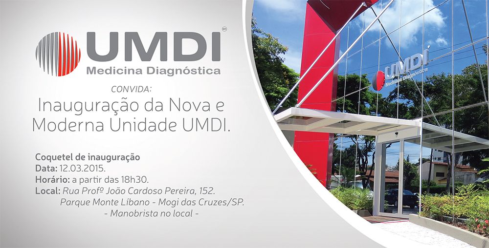 No dia 12 de março, a UMDI Medicina Diagnóstica, que há 25 anos atende a população de Mogi das Cruzes, Suzano e demais cidades do Alto Tietê, inaugura a Unidade Praça durante coquetel a partir das 18h30. Instalada em um edifício de 1.500 metros quadrados, com infraestrutura de ponta e equipamentos de alta tecnologia, essa unidade vem sendo bastante aguardada pela comunidade médica e pela população do entorno.