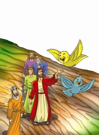 Certo dia, Jesus percebeu que as pessoas estavam se preocupando demais com determinadas coisas: com o jeito de se vestir, com o que iriam comer e o que teriam de fazer para ter dinheiro. Então, ele encontrou um jeito de tocar seu coração, dizendo: “Olhem para os pássaros. Eles não espalham as sementes, não colhem... e o nosso Pai do Céu os alimenta”. E também falou: “Olhem para os lírios do campo. Vejam como eles crescem. E nem mesmo o rei Salomão se vestiu como um deles...”.