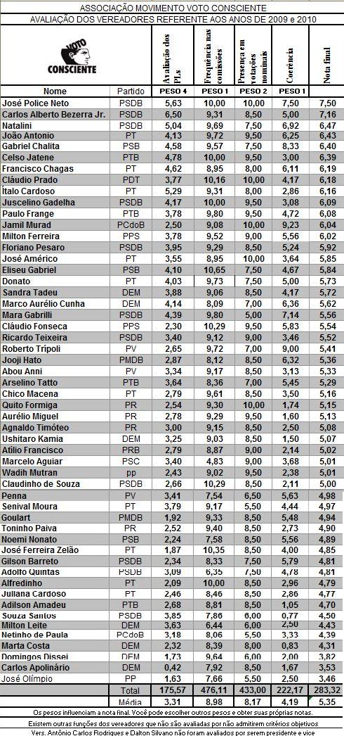 De acordo com Sonia Barboza, diretora e coordenadora do Voto Consciente na Câmara, o estudo que está sendo divulgado tem como base os anos de 2009 e 2010. “Estamos utilizando quatro critérios: impacto, na cidade, dos Projetos de Lei apresentados; presença nas comissões; presença nas votações nominais; e coerência entre as promessas de campanha e os projetos apresentados”.