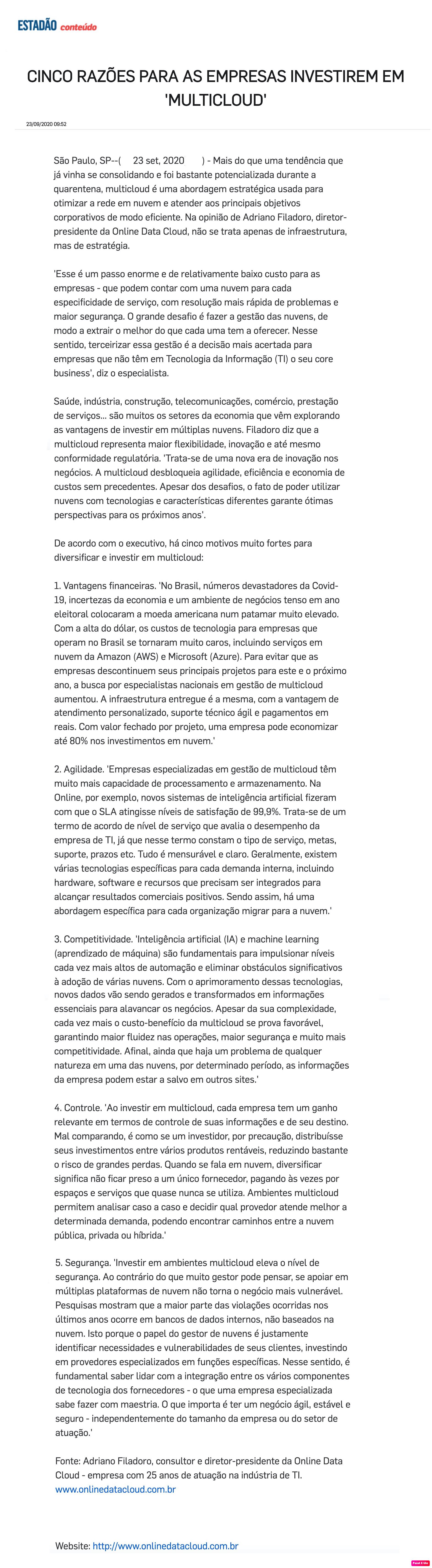 AGÊNCIA ESTADO (SITE) - Cinco razões para as empresas investirem em "multicloud"