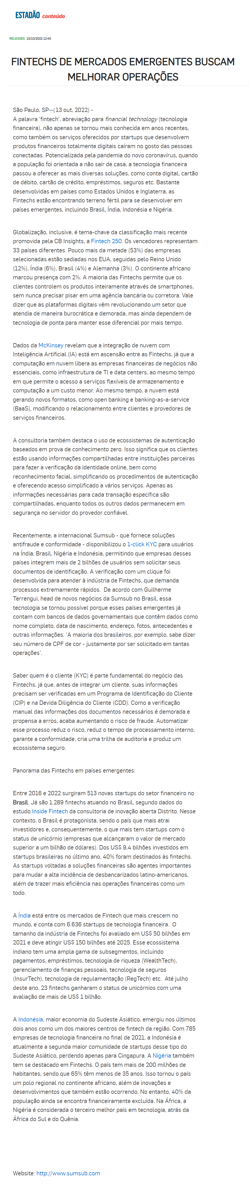 Clipping AGÊNCIA ESTADO (TIER 1) - Fintechs de mercados emergentes buscam melhorar operações 17/10/2022