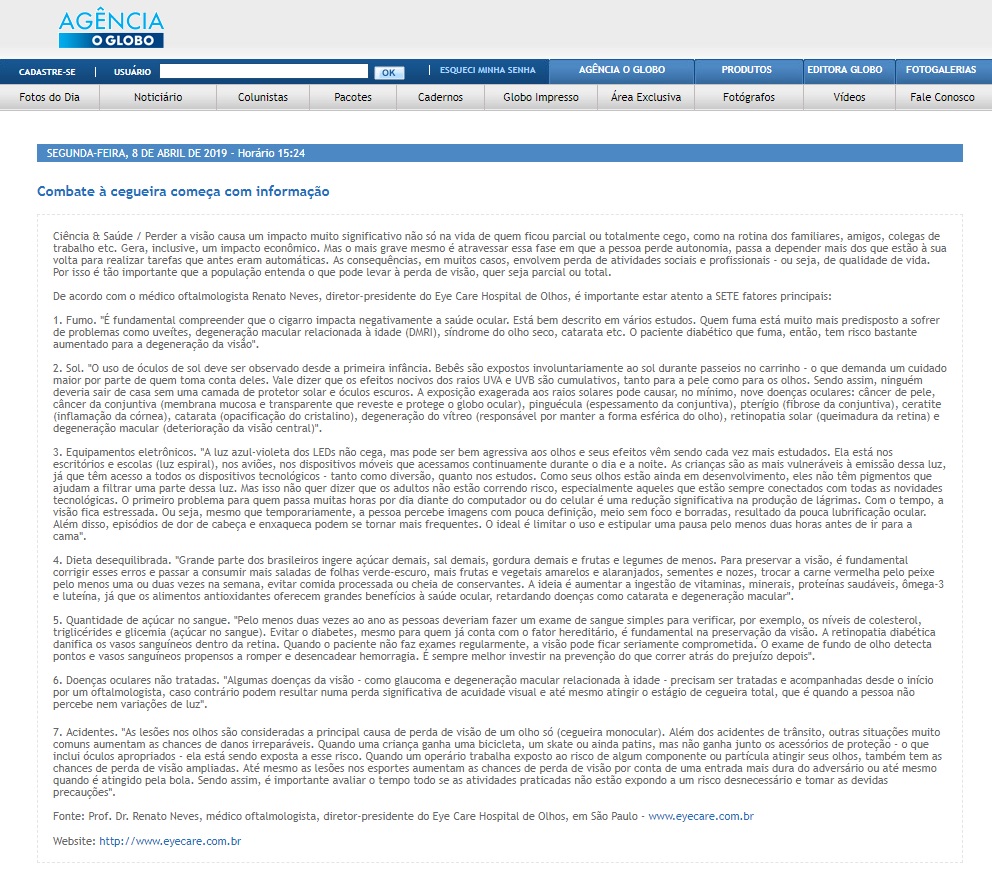 AGÊNCIA O GLOBO (SITE) - Combate à cegueira começa com informação