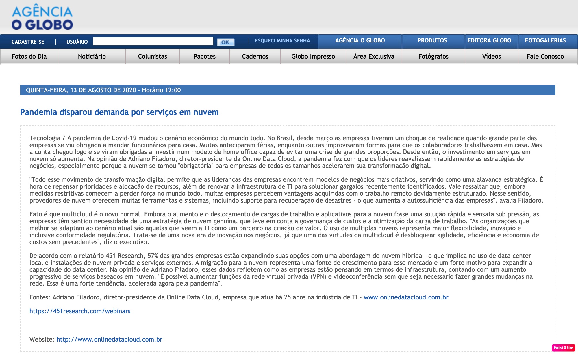 AGÊNCIA O GLOBO (SITE) - Pandemia disparou demanda por serviços em nuvem