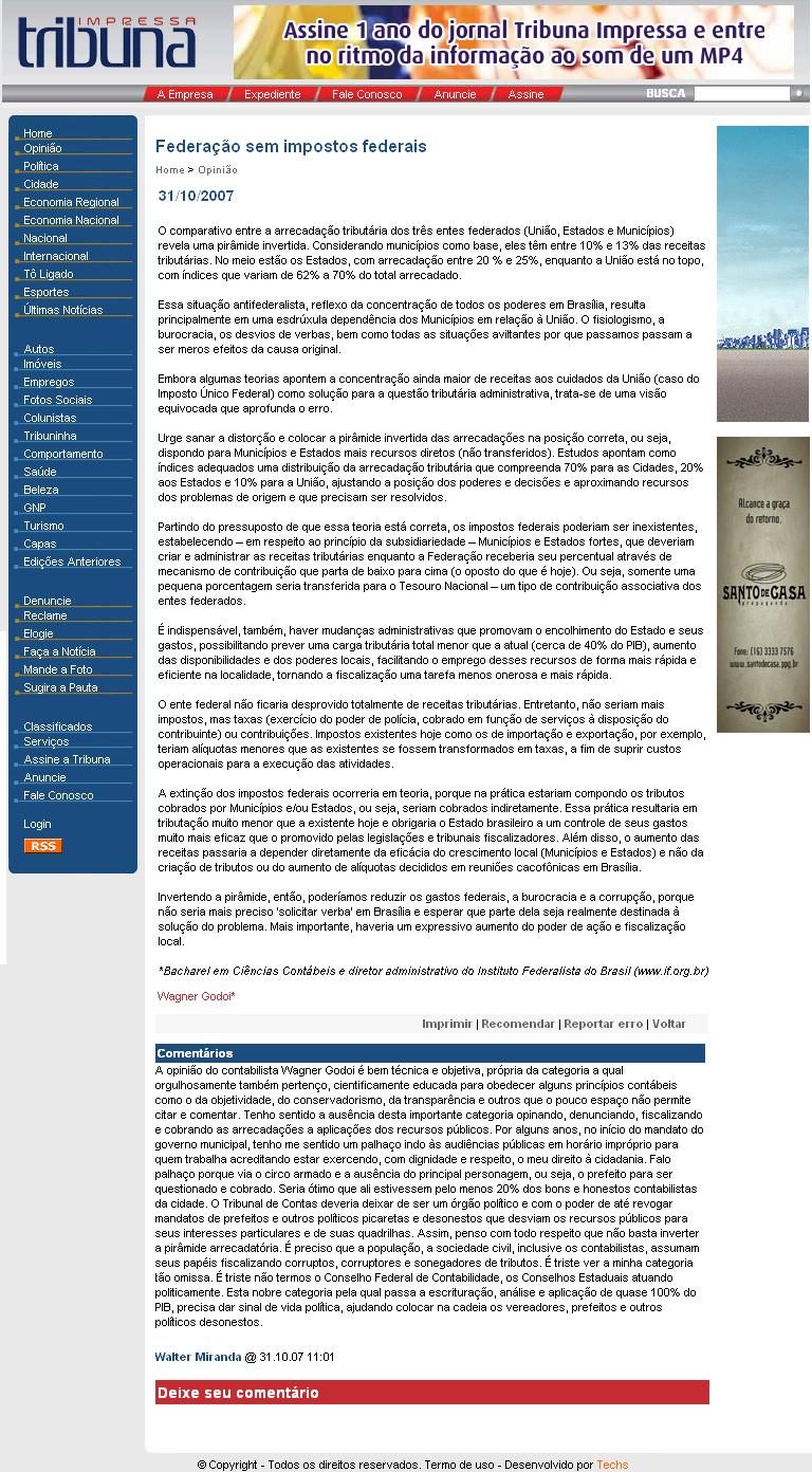 Clipping Tribuna Impressa de Araraquara - impresso/on line - (31 Out) - Partido Federalista 01/11/2007
