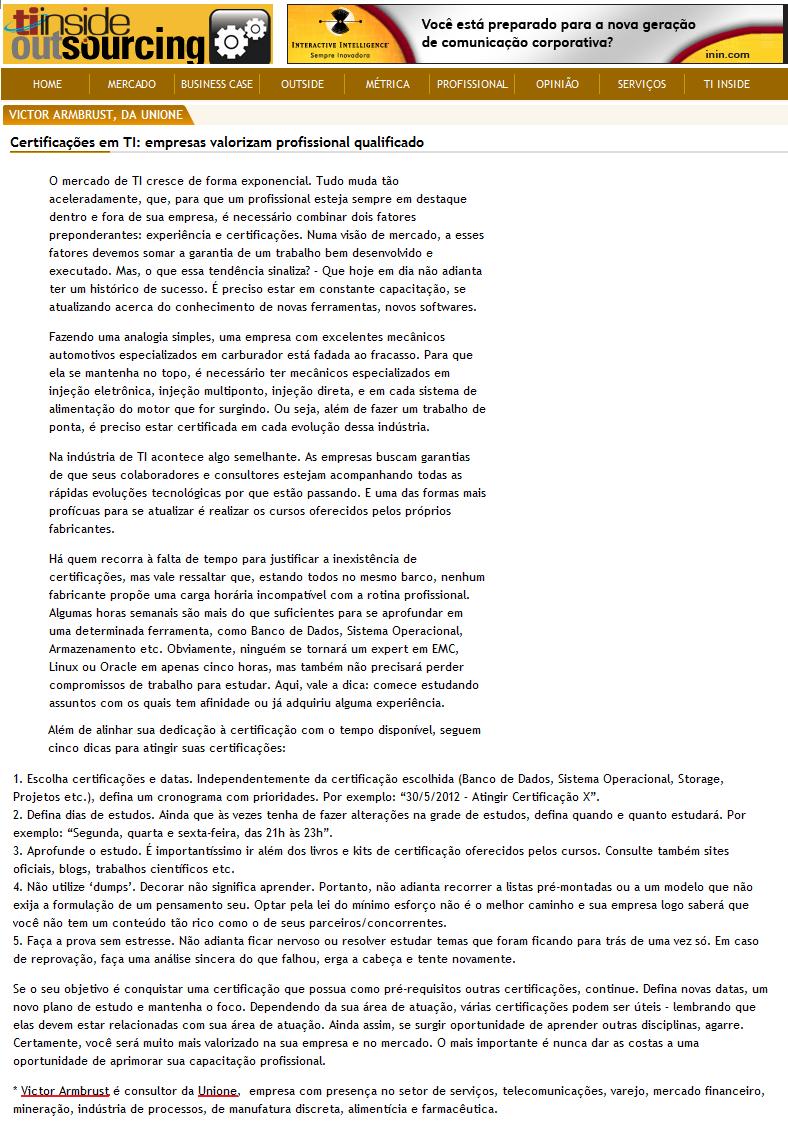 Clipping TI INSIDE OUT SOURCING - Certificações em TI: empresas valorizam profissional qualificado 12/04/2012